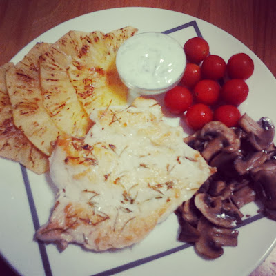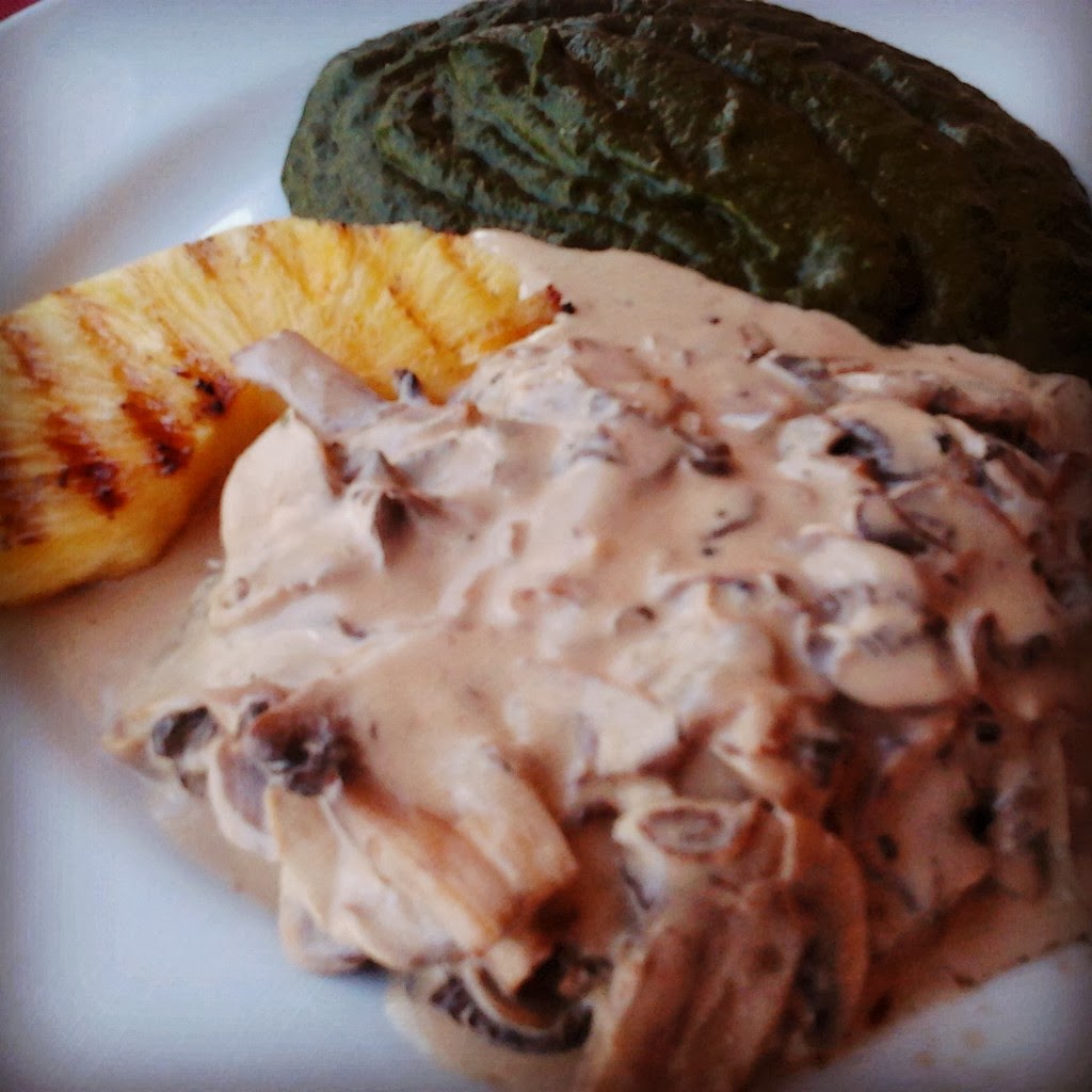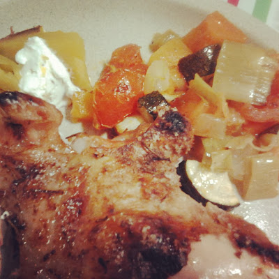 Neste caso acompanhei com puré de batata doce e salada de alface, rúcula, aipo, tomate, rábanos e coentros.